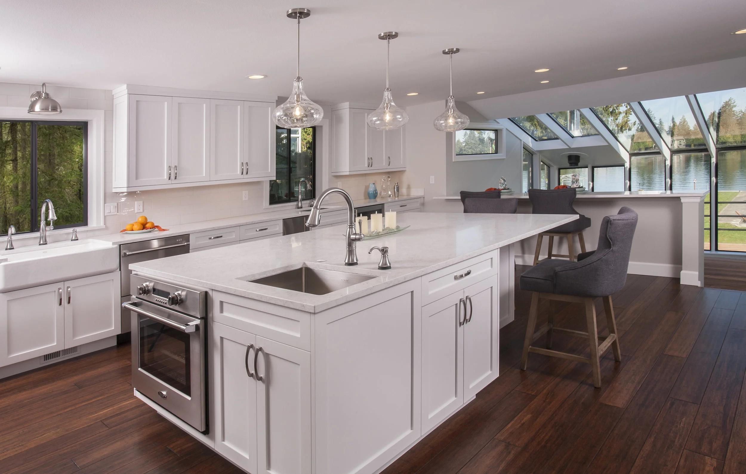 Would you look at that view? My clients wanted to entertain, so we conducted structural adjustments and major interior design improvements to ensure a large pro-grade kitchen to host family and friends. This total home renovation involved constructing additional main floor square footage and a complete redesign of three bathrooms and three bedrooms. With a glass tile powder room, custom fireplace, high-tech integration, Earth-friendly solid bamboo flooring, and vaulted living room, this smart home is downright unforgettable.